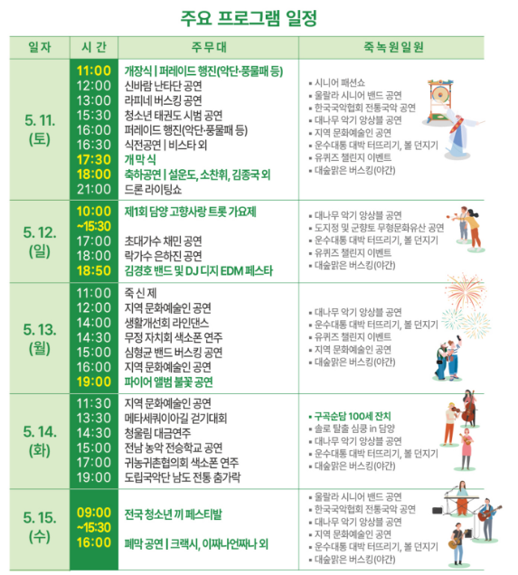 축제는 문화예술행사, 전국단위 경연대회, 다양한 체험 프로그램, 이벤트 프로그램 등으로 구성되어 있으며, 담양의 농특산물과 향토음식을 맛볼 수 있는 기회 또한 제공합니다.