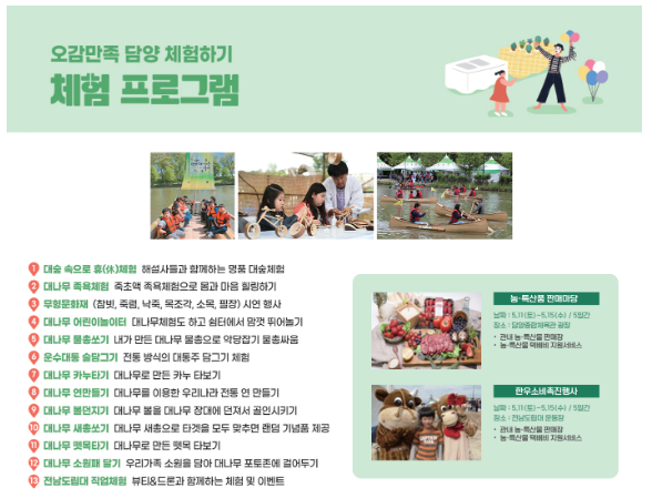 대나무 뗏목과 카누체험, 대숲 속 휴(休) 체험, 운수대통 술 담그기, 대나무 물총 만들기 등 대나무를 활용한 다양한 프로그램이 준비되어 있습니다.